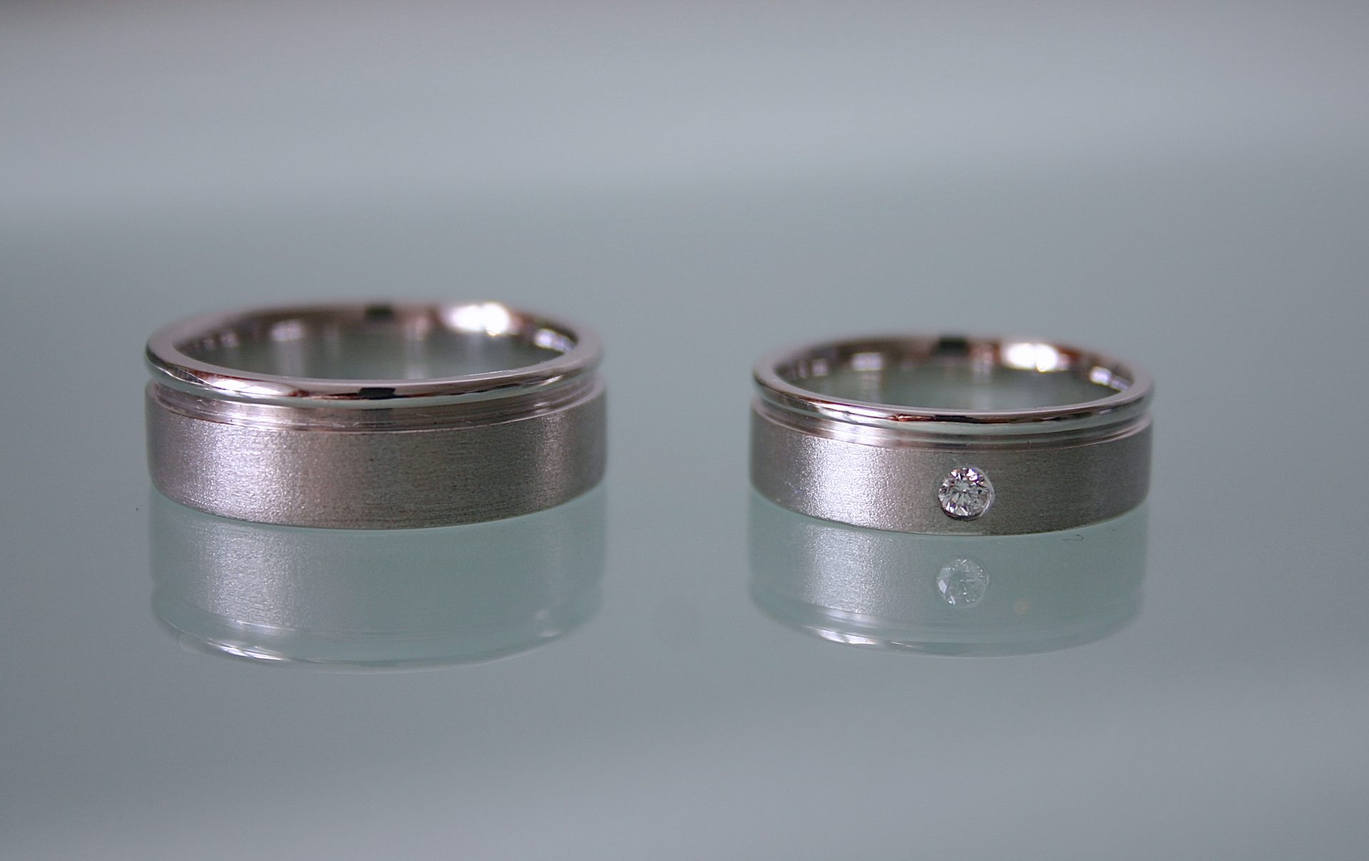 Material: Weißgold, 14 Karat, im Damenring befindet sich ein Brillant (0,05 ct., Tw., Vsi)